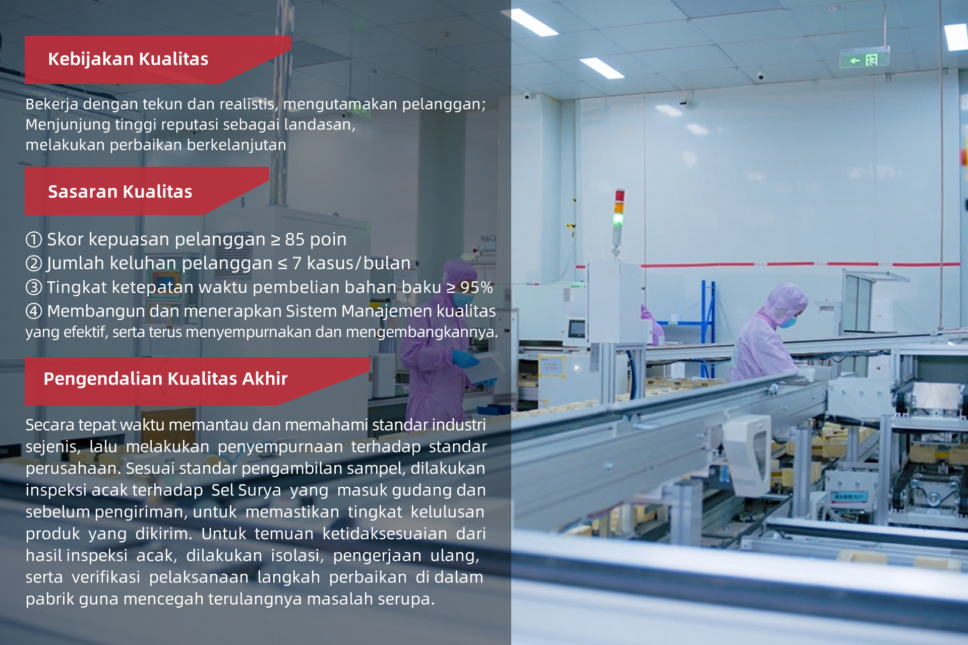 Berdasarkan standar yang berlaku, melakukan pemeriksaan penerimaan terhadap bahan baku. Untuk bahan baku dengan kualitas yang tidak sesuai, dilakukan analisis penyebab serta umpan balik atas ketidaksesuaian tersebut. Pemeriksaan dilakukan dengan terus menyempurnakan metode pengujian, memperbaiki standar pemeriksaan bahan baku, serta meningkatkan kemampuan pengujian. Selain itu, perusahaan juga melakukan evaluasi berkala dan konfirmasi kualifikasi tahunan terhadap pemasok; mengelola dan memberikan umpan balik atas informasi kualitas dalam lingkup yang menjadi tanggung jawab, serta mengoordinasikan rapat analisis kualitas dengan departemen terkait.