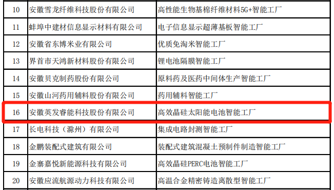 2022年2月22日,安徽省经济和信息化厅发布了《2022年安徽省智能工厂和数字化车间名单公示》,拟评定36个项目为安徽省智能工厂、170个项目为安徽省数字化车间。经公示无异议后,安徽英发睿能科技股份有限公司被评为高效晶硅太阳能电池智能工厂,这也是2022年天长市第一批智能工厂和数字化车间唯一一家通过的企业。